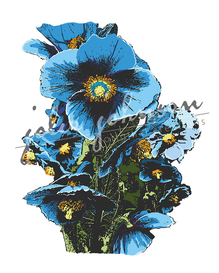 A commissioned digital illustration of Himalayan blue poppies growing in Alaska. Printed as museum quality giclee prints and note cards.