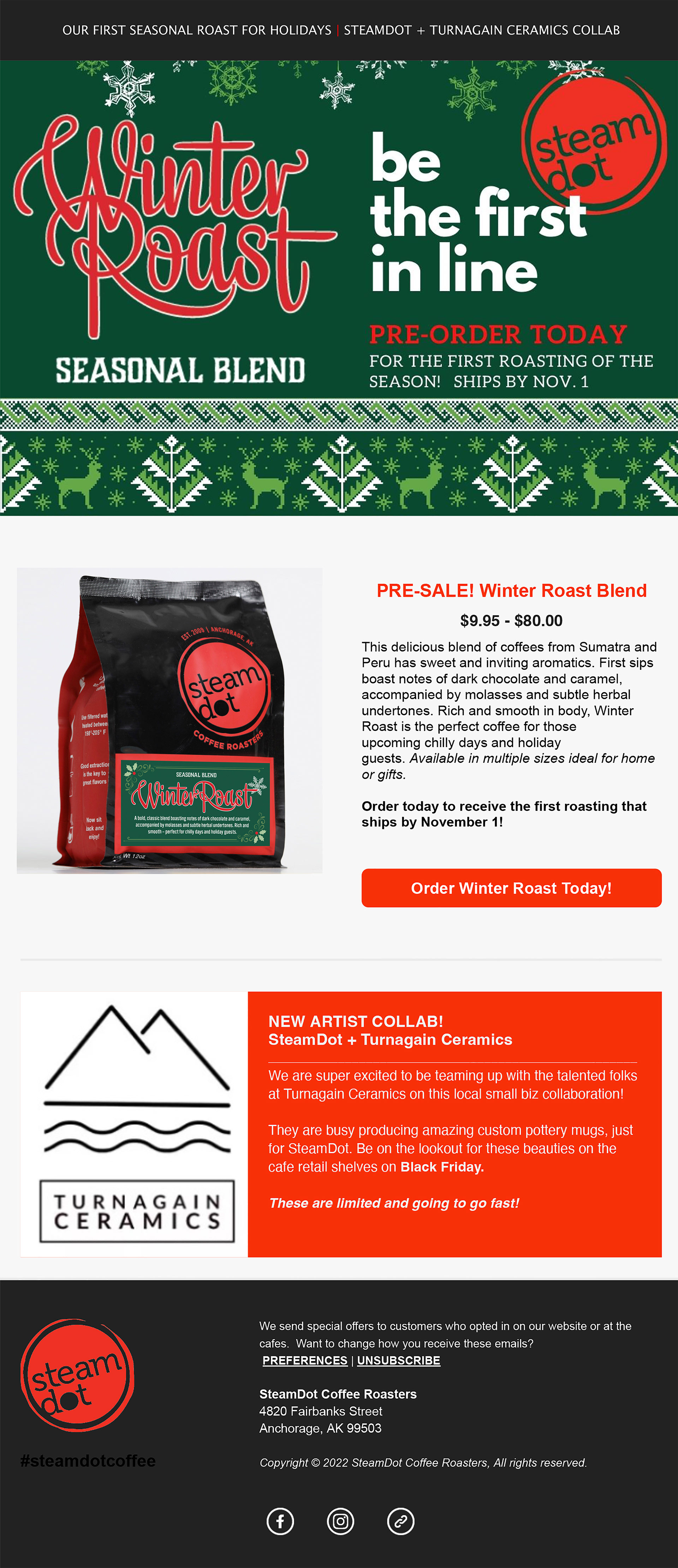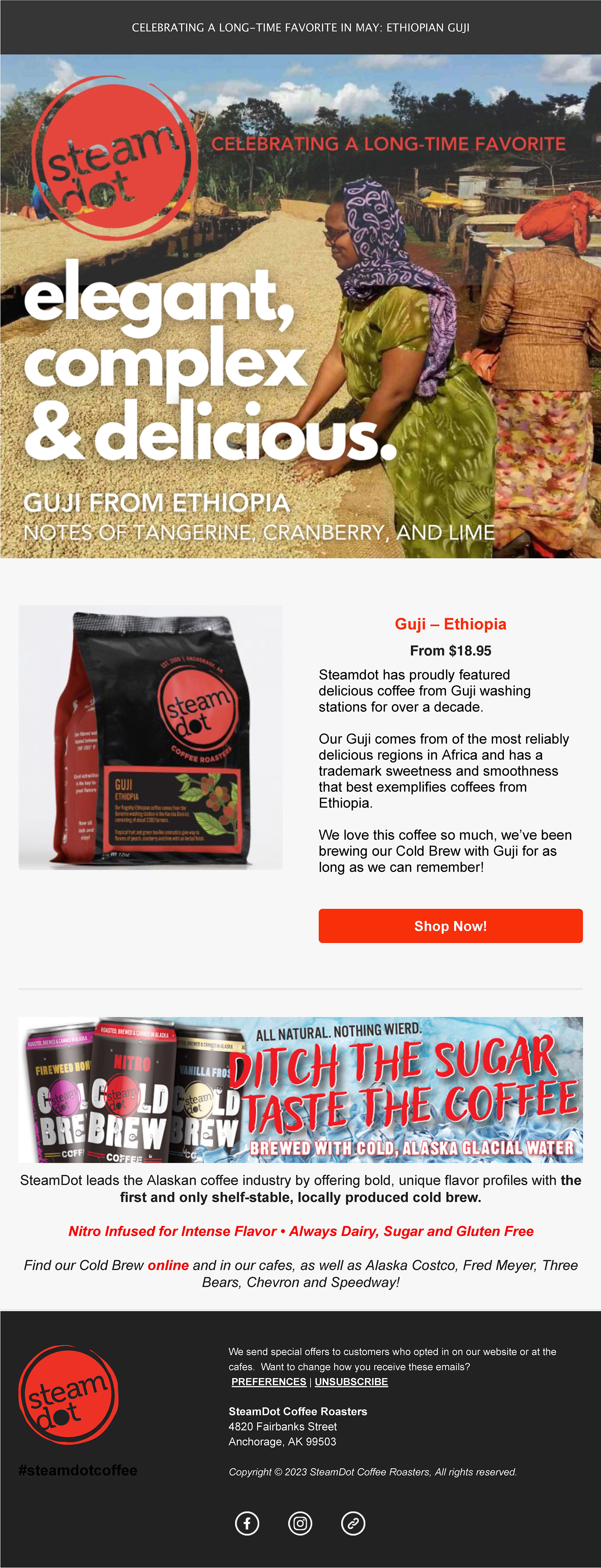 Samples of multiple email marketing campaigns produced monthly for a local coffee company. Content was based on special events or new product releases, and duplicated across multiple channels to maintain brand and campaign consistency. Campaign analytics were tracked each month for opens, bounces, clicks, database growth, direct online sales and attributable cafe sales.